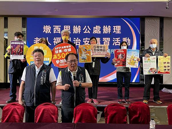 活動中賴區長向與會長輩宣導,自10/26至12/26止的2023「臺中購物節」活動,在台中消費不論發票或收據都可登錄台中通暨購物節APP,一起來消費抽現金、抽汽車、抽好宅,總獎項價值近2億5,000萬元。