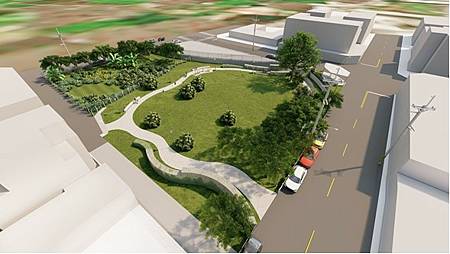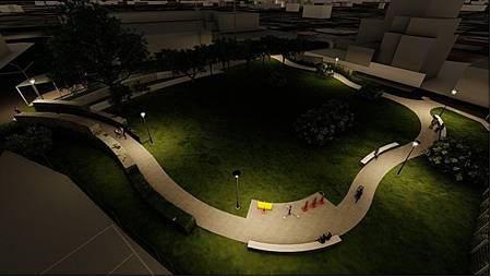 此外,步道周邊配置有休憩座椅、照明燈具及體健設施區,提供民眾休憩及運動,夜間仍有足夠照明散步;中央則保留大片陽光草坪作為運動及地方舉辦活動的空間,並配置簡易澆灌設施以利後續維護管理;基地內也將修剪既有雜木,打造舒適休閒的綠地空間。