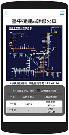 此外,中捷公司表示,台中市幹線公車分別行經捷運高鐵台中站、市政府站、文心中清站、文心崇德站、松竹站等車站,形成台中市區的大眾運輸主幹路網,為使公車與捷運系統發揮「1加1大於2」功效,台中捷運App新加入「幹線公車」功能,可以查詢下2班公車即時到站資訊,民眾轉乘更方便。