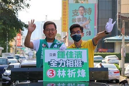 選戰黃金倒數階段,十分感謝鍾佳濱委員特地排除萬難,遠從屏東帶來滿滿的祝福與支持,全力相挺祈烽,集中選票力保民進黨西屯第二席✅在佳濱委員的加持下,祈烽會努力繼續衝,請大家讓我為西屯再拼四年🏃♂️