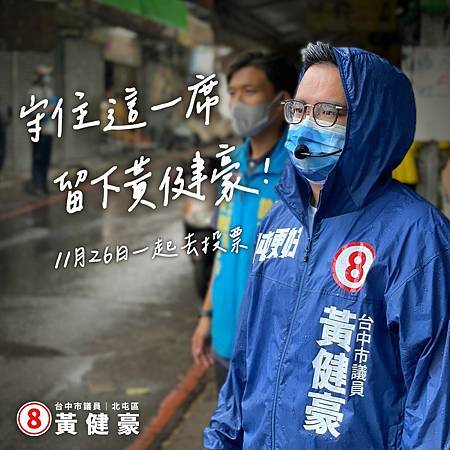 北屯是我們共同的家鄉、也是我們唯一的家園,我們都是一起建設北屯的好夥伴,這一次請各位夥伴為我加油,守住這一席,留下黃健豪,11月26日一起去投票吧!