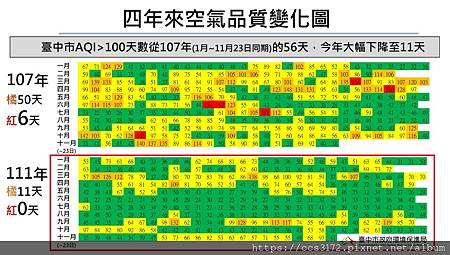環保局提到,中央訂有空氣品質日平均標準,為每立方米必須小於35微克,根據環保署空品統計數據顯示,107年1月1日至11月23日止共計301天符合標準,今年同期比較已提升至323天,空氣品質良好至普通的天數共增加22天,顯示空品改善幅度顯著。
