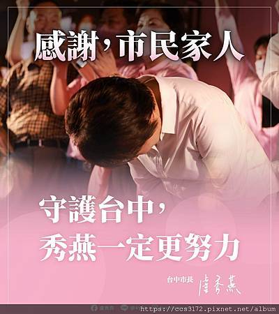 秀燕感謝所有參選的好朋友,市長兩位競選夥伴,蔡其昌副院長及陳美妃女士,以及不分政黨的議員及里長候選人,我相信每個人願意參選都是因為愛台中,都是想為自己的故鄉打拚,唯有大家一起來,台中才會更好,只要是對台中市有幫助,秀燕都會努力實現。