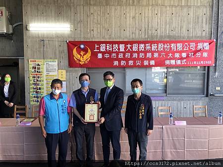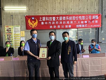 「上銀科技股份有限公司」及「大銀微系統股份有限公司」捐贈台中市政府消防局第六救災救護大隊春社分隊空氣呼吸器1批、無線電機4組及數位無線電機動轉播機1組,今(29)日在消防局春社分隊辦理捐贈儀式,由消防局副局長楊元吉代表受贈,消防局對兩公司表達感謝,盼藉此吸引更多企業響應,守護市民安全。