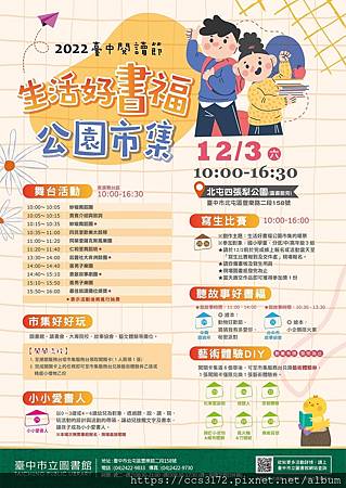 台中市政府文化局表示,台中閱讀節從11月起至12月底串連台中市立圖書館和所屬44個圖書館,透過精彩豐富的活動展現多元閱讀風貌,今年邁入第5年的「生活好書福」市集活動,尤其受到市民歡迎,將邀請讀書會、圖書館、故事協會、出版社、大專院校等閱讀夥伴,以說故事、闖關遊戲、藝術體驗等方式,帶領民眾體驗多元閱讀的美好,同時也舉辦最佳旅讀攤位票選活動,讓民眾逛攤位、看表演時,也能感受「生活好書福」的樂趣。