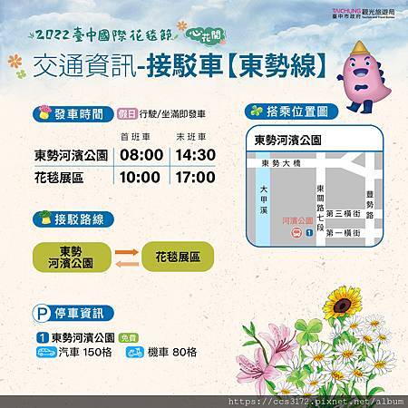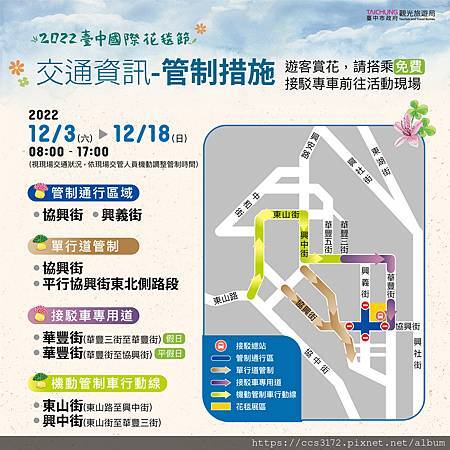 觀旅局指出,今年花毯節周邊道路管制時間為每日早上8時至下午5時,將視現場交通狀況彈性調整管制時間,鼓勵民眾搭乘免費接駁專車賞花毯,也提醒出門旅遊仍應遵守防疫規範,搭乘接駁專車時及展區人潮擁擠時請戴口罩,維持社交距離,保護自己也守護他人健康。詳細交通接駁資訊可上「2022台中國際花毯節」活動網站(https://www.flowercarpet.tw)及台中觀光旅遊網(https://travel.taichung.gov.tw/)查詢。