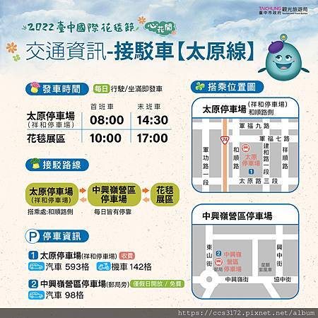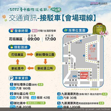 觀旅局提到,「台中國際花毯節」向來與新社花海共同舉辦,已成為全台重要花卉慶典之一,今年行政院農業委員會種苗改良繁殖場因考量國家糧食安全,停辦新社花海,觀旅局因應振興地方觀光需求,向種苗場借用土地辦理花毯節,因場域空間有限,展區內未規劃停車場,因此透過5條免費接駁路線,分別為每日行駛的豐原線、太原線及松竹線、假日行駛的東勢線及會場環線,讓遊客可至外圍指定停車場停放車輛,再轉搭免費接駁專車,方便到訪花毯節。