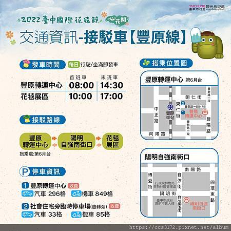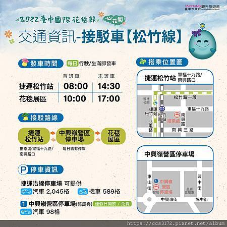 觀旅局說明,大眾運輸部分,搭乘高鐵的民眾可轉乘台鐵至松竹車站或豐原車站,再轉松竹線或豐原線接駁車;自行開車的民眾,可將車輛停放在捷運沿線停車場,搭乘捷運至松竹站轉乘松竹線接駁,或將車輛停放在豐原轉運中心、太原(祥和)、中興嶺營區(郵局旁,僅假日開放)等停車場,再轉乘周邊免費接駁車至展區。