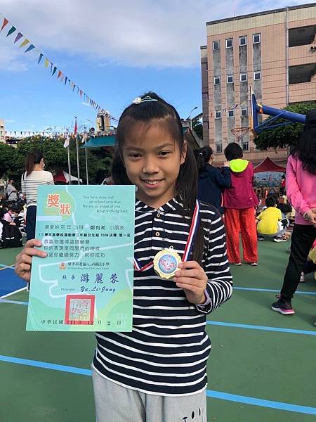臺中市北區中華國小12月2日舉辦學校運動會,鄭有希同學代表班上參加女子組100公尺田徑賽跑,榮獲全校三年級女子組第一名!