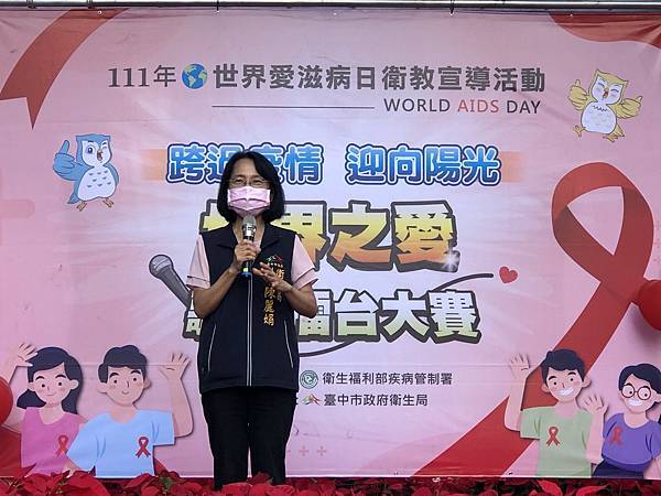 12月1日為世界愛滋病日,台中市政府衛生局今(3)日在一中益民商圈舉辦世界愛滋病日衛教宣導活動,以「跨過疫情迎向陽光」為主題,辦理歌曲競賽活動,推廣安全性行為,吸引約500人共同響應。副局長陳麗娟表示,市府遵循世界衛生組織(WHO)95-95-95策略,希望達到95%的感染者藉由篩檢知道病況、95%知道病況者能按時服用藥物,以及95%的服藥者病毒量能成功被抑制,也呼籲民眾尊重並關懷愛滋病患,消除歧視。
