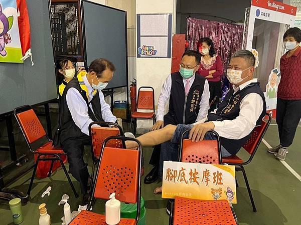 社會局彭局長當日背著本區長青文創專屬書包及文創小物出席活動,致詞時肯定本區自辦長青學苑的努力,並鼓勵長者能多多參與學苑課程,也特別巡視學苑靜態展示成果區,體驗腳底按摩班所學功夫。