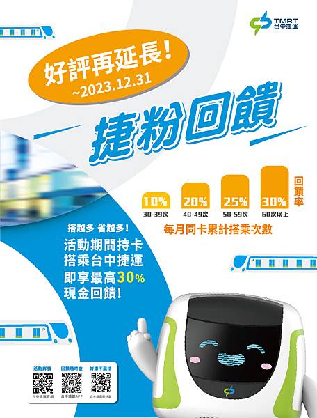 台中捷運為服務通勤客群,110年9月推出捷粉回饋專案,每月只要搭乘次數達30次以上,即可享現金回饋,廣受上班族、學生等通勤客群喜愛,推行至今捷粉人數成長約3.8倍。中捷公司宣布,捷粉回饋專案明年將持續實施,並將推出更具亮點的捷粉活動,讓旅客搭中捷享回饋,更享各式好康。