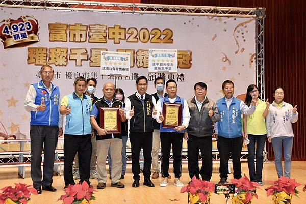 此外,典禮中陸續頒獎前五名績優委託經營市場廠商,包括全聯實業股份有限公司台中山西店及台中新芳店、俥亭停車事業股份有限公司、老地方國際有限公司及萊爾富國際股份有限公司,表彰獲獎廠商在經營市場績效評核中,成績卓著;以及無車市場環境評選計畫中前三名的向上民有零售市場、大肚公有零售市場及太平公有零售市場,嘉勉自治會與攤商共同推廣無車市場環境,打造低汙染、低碳的消費空間。