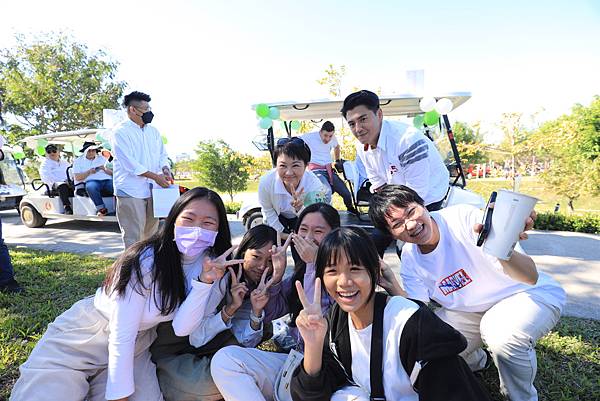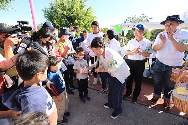 盧市長隨後也搭上高爾夫球車沿路和野餐民眾打招呼,跟民眾、毛小孩自拍,並發放聖誕節糖果餅乾禮盒給小小朋友。許多家庭準備野餐籃、鋪著限量紀念野餐墊拍照,並帶著小朋友聽故事媽媽劇場,台中市的城市吉祥物石虎也現身跟大小朋友合影,現場氣氛極為chill!