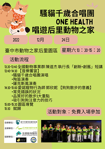社團法人台灣亞洲動物福利協會(Asia Animal Welfare Association,簡稱AAWA)以動物福利與全人關懷為協會宗旨,積極創造並參與各種公益活動;AAWA旗下設有「騷貓公益咖啡」,由20多位 70 歲以上的銀髮志工隊駐點營運,台中市動物保護防疫處與騷貓公益咖啡合作,今(12)日舉辦記者會,為將於12月24日在動物之家后里園區舉辦「騷貓合唱團One health唱遊后里」公益音樂會,揭開溫馨序幕。