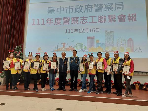 臺中市政府警察局於12月16日下午辦理111年度警察志工聯繫會報,配合聖誕節假期將至,會中特別準備聖誕帽等相關飾品供與會志工佩戴,以營造年節歡樂氣氛。局長蔡蒼柏於會中頒發警察志工大隊大隊長游信對續任聘書,並轉頒111年內政業務志願服務金、銀質獎座獲獎志工15位,及頒發該局志工運用6個績優單位、志工楷模81位,感謝他們在警察志工崗位上的付出與辛勞。