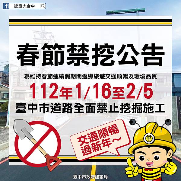 維持春節連續假期間返鄉旅遊交通順暢及環境品質,台中市政府建設局表示,112年1月16日至2月5日元宵節,除緊急搶修工程、經許可的道路養護刨封作業及孔蓋啟閉外,禁止於台中市相關道路範圍內辦理挖掘施工,請相關單位全力配合,讓市民歡樂過好年。